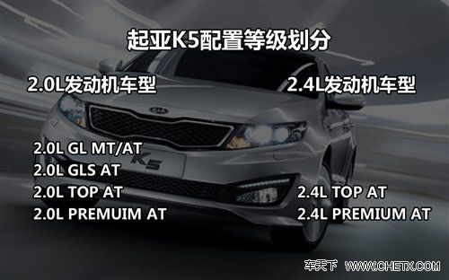 从车型名称上可以看出针对配置的不同起亚K5共分为4个级别,顶配与次顶配从名称上看似乎只有装配的发动机不同,其实不然,在配置上它们之间还是存在着一些不同。