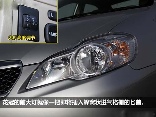 对比还是先从前大灯开始,花冠的前大灯十分修长,整体造型就像一把锋利的匕首,而大灯的眼角部位就是这把匕首的刀锋,斜着插入蜂窝状的进气格栅,很好的把两者衔接在一起。大灯在功能方面比较单一,只有手动高度可调这一项功能,大灯灯组也只是使用了普通的卤素灯泡。