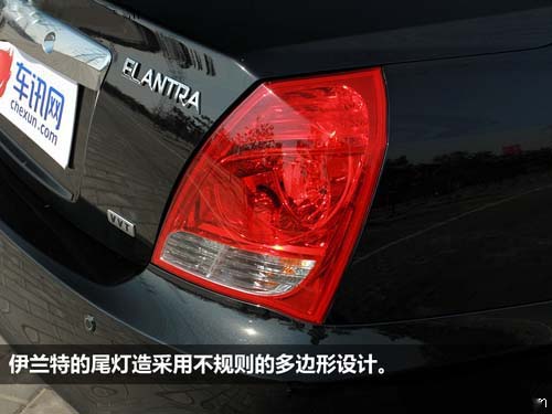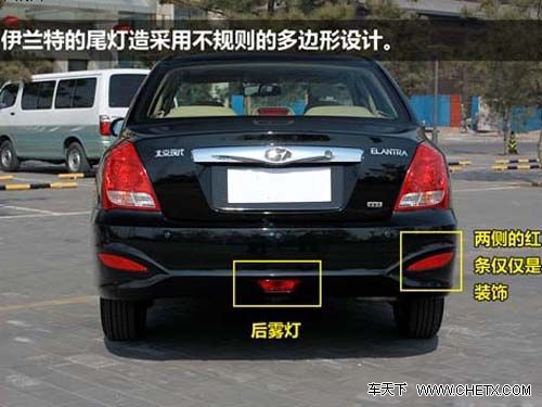 比起犀利的前大灯,花冠采用镀铬条装饰的尾灯要内敛不少,也比较显档次,圆润的造型多了几分亲切感,也更契合车尾的整体风格。伊兰特的尾灯造型跟前大灯首尾呼应,采用不规则的多边形设计,让车尾更显时尚动感。此外,伊兰特还配备了显眼的后雾灯,两侧的两个红条仅是装饰作用,真正的雾灯是中间的那个。