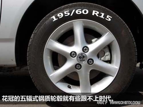 轮胎方面,花冠采用了尺寸为195/60R15的普利司通轮胎,普利司通作为世界轮胎业三巨头之一,品质值得信赖,但15寸的五辐式钢质轮毂就有些跟不上时代步伐了,怨念啊!