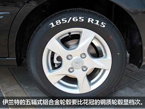 伊兰特采用的是锦湖185/65R15的轮胎,轮胎品牌上不如普利司通,不过其15寸的五辐式铝合金轮毂看起来要比花冠的钢质轮毂显档次。