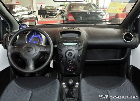 F0尚酷版全黑内饰凸显了小车的运动感,更为其增添了一分时尚感,中控台设计很是简洁明了,易于操作。除了左右两边空调出风口,中控台上方还有一个较大面积出风口。尚酷爱国版的配置变化主要集中在娱乐系统上,F0尚酷爱国版将在铉酷型、悦酷型上增加AUX、SD、USB数码音响三输入通道取代原时尚爱国版收音机+CD的模式,更加符合年轻消费者的需求。