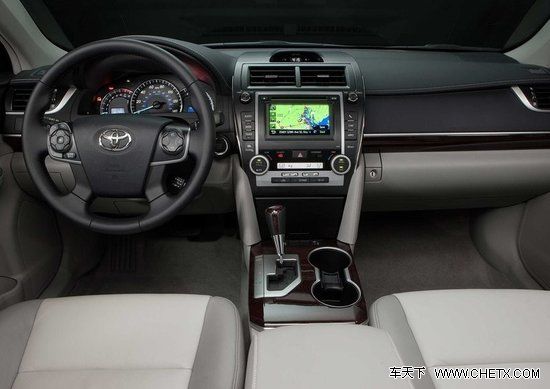 根据23日对外发电部的内饰图来看,很明显与日本版内饰略有区别,国产型新一代凯美瑞到底采用那个内饰方案还留有疑问(目录资料不公布内饰),只能留待上市前的谍照或官方公布;目前只能根据23日的图样来看看新凯美瑞的内饰,其整体延续了现款车型的设计理念,带有液晶屏的中控台看起来简洁大气,音响和空调为一体化设计。6.1寸液晶屏集成GPS和Entune infotainment system信息系统。高配车型将配置带有换挡拨片的三幅式运动方向盘,还将配备JBL音响系统。