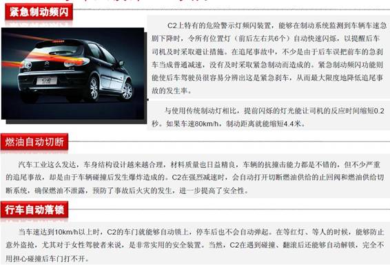 总之2012款C2是一款内外兼修、内涵丰富的精品小车,它外在魅力十足、经典耐看;内部空间合理、乘坐舒适;独立悬挂、高强度吸能全承载式车身以及车载灵性网络(CAN-BUS)使得这款小车在品质上得到了越级提升,融魅力、活力、实力于一体,是小车大设计的出色之作。