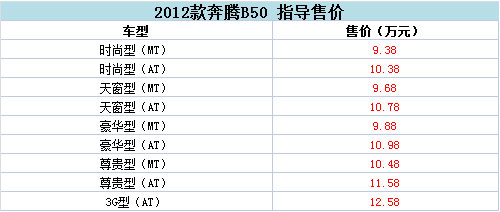 2012款奔腾B50正式上市 售9.38-12.58万
