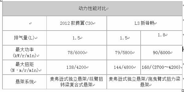 腾翼C30搭载的是长城汽车开发的1.5升GW4G15全铝汽油机,采用双顶置凸轮轴、4缸16气门、塑料进气歧管、先进的VVT技术,具有重量轻、功率大、油耗低、噪声小、低排放、结构紧凑等特点,尤其在低转速下能发挥出强大扭矩,得到最佳的动力输出,与L3新锋畅相比可谓是不分伯仲。