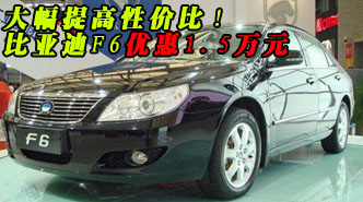 深圳比亚迪F6优惠1.5万元 大幅提高性价比! 车天下汽车网 发表于:2009-11-02 09:53 [车天下深圳行情]近日编者走访深圳4S店获悉,性价比出众的比亚迪F6车型近期出现比较大的优惠促销活动,优惠最高可达1.5万元。 -