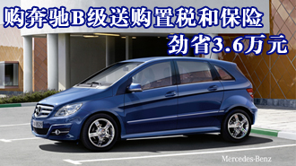购奔驰B级送购置税和保险 劲省3.6万元 车天下汽车网 发表于:2010-11-13 10:30 【车天下深圳讯】近日,车天下编辑从深圳奔驰4S店仁孚特力公司获悉,现在购奔驰B级车型,可以获赠全额购置税和一年的全额保险。以入门级的动感型28.8万元的车身价计算,节省购置税在2.4万元左右,而一年的全额保险 -