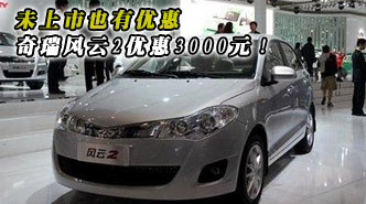 未上市也有优惠 奇瑞风云2优惠3000元! 车天下汽车网 发表于:2009-10-29 09:56 [车天下深圳行情]风云2是奇瑞主打的运动型家轿之一。 -