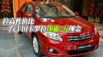 拉高性价比 一汽丰田卡罗拉优惠1万现金 车天下汽车网 发表于:2009-10-19 11:16 卡罗拉作为一汽丰田的主力车型,自上市以来深受家用汽车消费者的喜爱,其销量也一直不错。 -